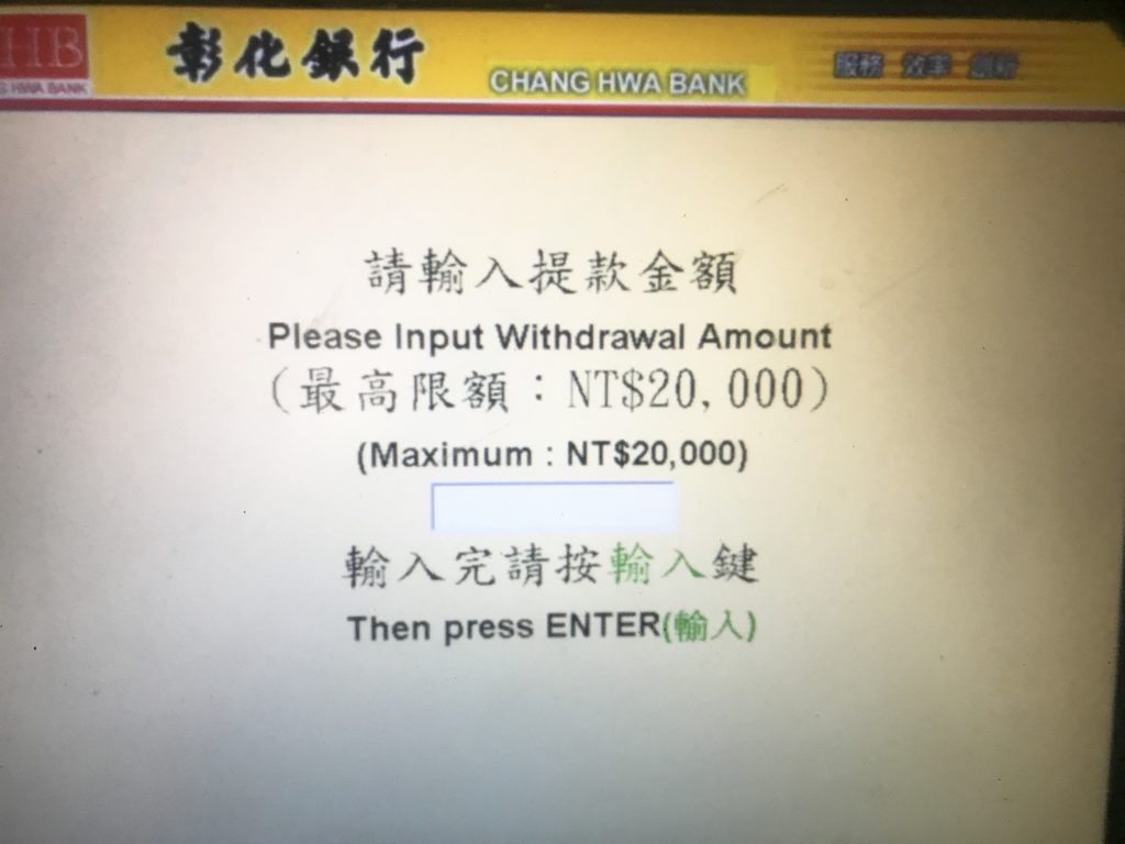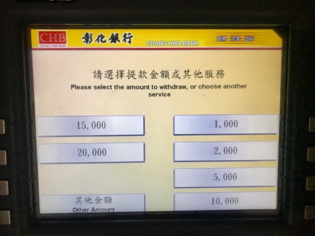一回の引き出し限度額は2万台湾ドル(約7万円)ですのでご注意ください!