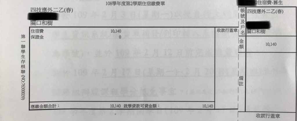 寮費 : 10,140台湾ドル(約37,000円)